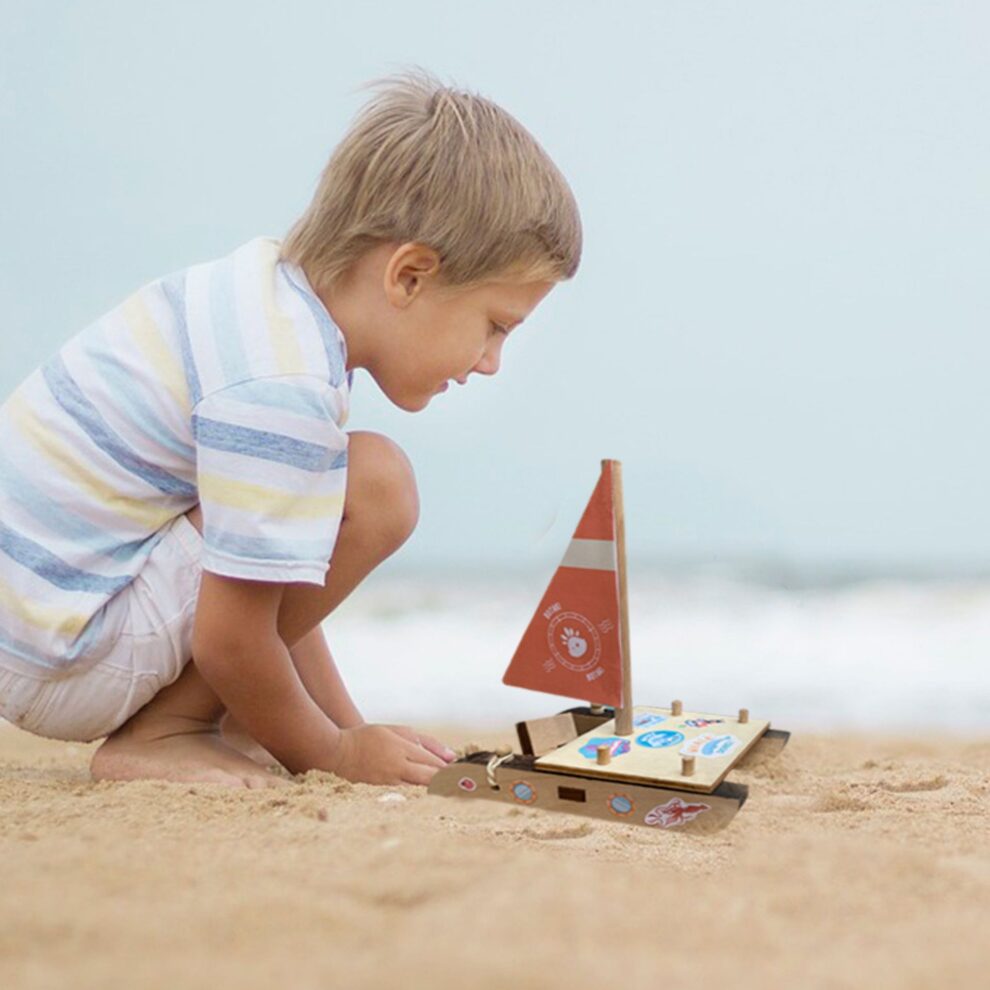 Avec ce kit de construction sur l’océan, les enfants fabriquent un catamaran en bois. Une fois le montage terminé, ils peuvent le décorer avec la voile et les stickers résistants à l’eau fournis.