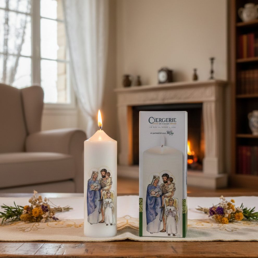 Cierge blanc de la Famille de la Miséricorde conçu et fabriqué dans les ateliers de la Ciergerie Notre Dame de France au Puy en Velay en collaboration avec Petit Page qui a dessiné l’illustration de la Sainte Famille !