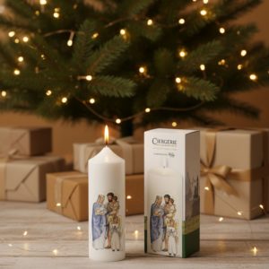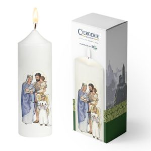 Cierge blanc de la Famille de la Miséricorde conçu et fabriqué dans les ateliers de la Ciergerie Notre Dame de France au Puy en Velay en collaboration avec Petit Page qui a dessiné l’illustration de la Sainte Famille !