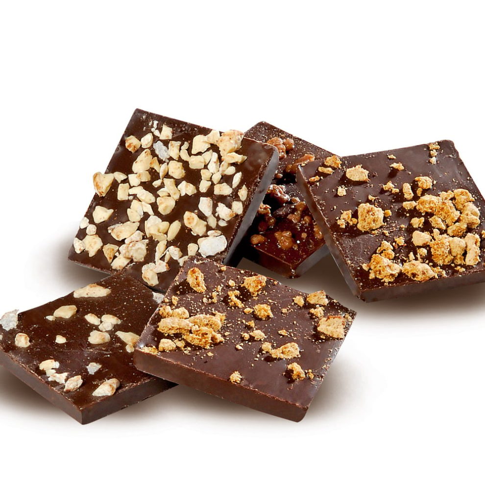 Ingrédients : Chocolat (pâte de cacao, sucre, poudre de LAIT entier, beurre de cacao, émulsifiant : lécithine de SOJA, arôme naturel de vanille. Chocolat noir: cacao : 70% minimum. Chocolat au LAIT : cacao : 33% minimum), NOISETTES, bonbons de chocolat au LAIT dragéifiés (sucre, beurre de cacao, LAIT écrémé en poudre, pâte de cacao, BEURRE patîssier, farine de BLE, petit-LAIT filtré en poudre, amidon de riz, émulsifiant: lécithines, concentrés de fruits et de plantes (carthame, radis, carotte noire, citron, hibiscus), concentré de spiruline, agents d’enrobage : cire de carnauba, cire blanche d’abeille, arôme naturel de vanille), éclats de caramel au BEURRE salé enrobés de beurre de cacao (sirop de glucose, sucre, LAIT concentré sucré, BEURRE doux, sel, BEURRE salé, beurre de cacao 8%, gomme arabique), NOIX, spéculoos concassés (farine de BLE, sucre, huile végétale (colza), sirop de candi, BEURRE concentré, poudre à lever : carbonate acide de sodium, sel, cannelle), céréales enrobées de chocolat (chocolat (pâte de cacao, sucre, beurre de cacao, matière grasse LAITière, émulsifiant : lécithine de SOJA, arôme naturel de vanille), céréales croustillantes (farine de BLE, sucre, farine de malt de BLE, amidon (BLE), poudre à lever : bicarbonate de sodium, sel, beurre de cacao, arôme naturel de vanille), sirop de glucose, sucre, agent d’enrobage : gomme arabique), grué de cacao caramélisé (fèves de cacao 70%, sucre, caramel (sucre, eau)).