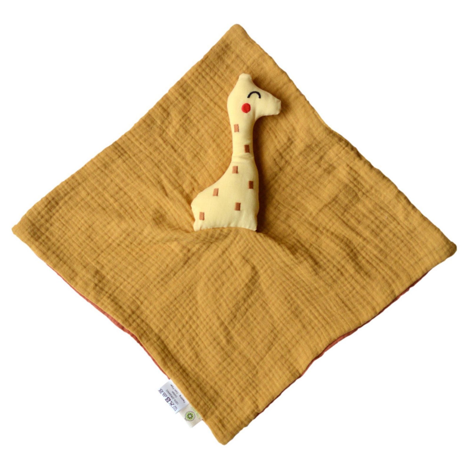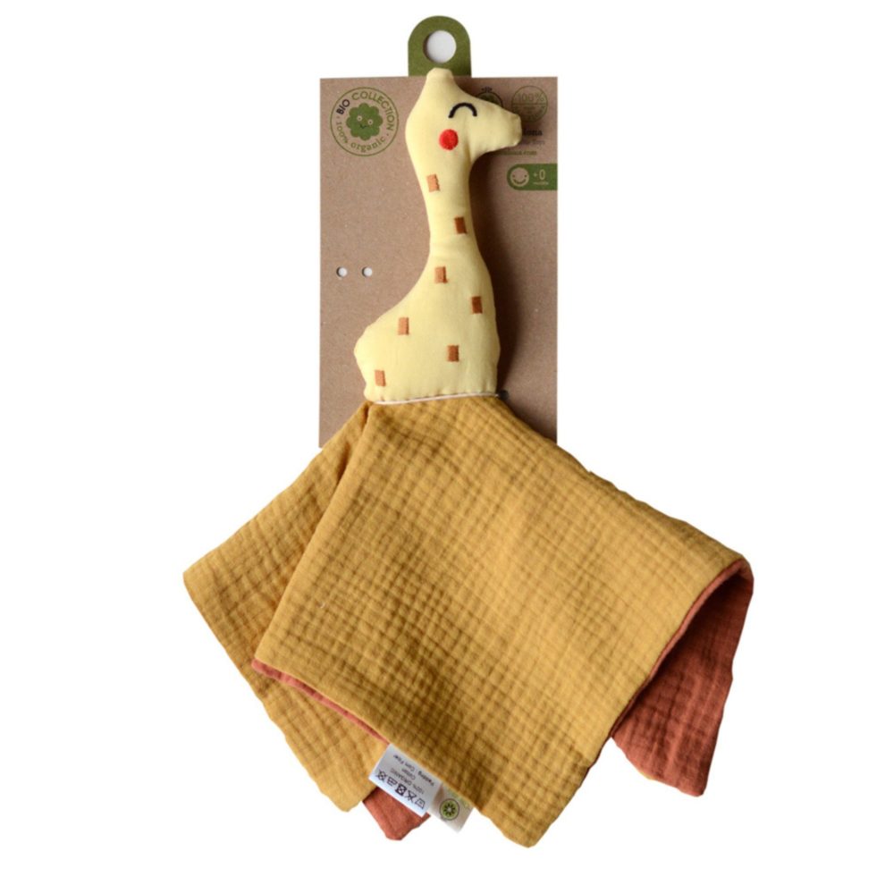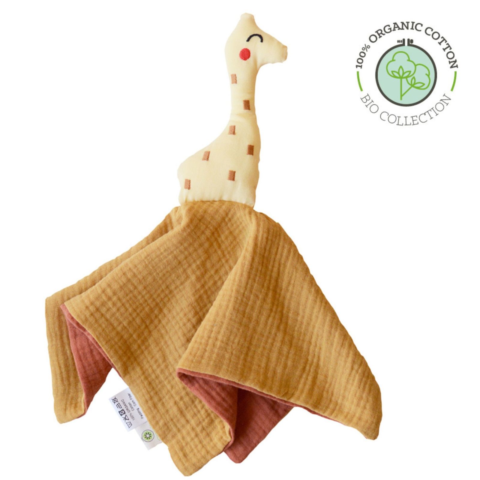 Doudou girafe est fabriqué en coton bio certifié Gots et sa tête est rembourrée en fibre de maïs.