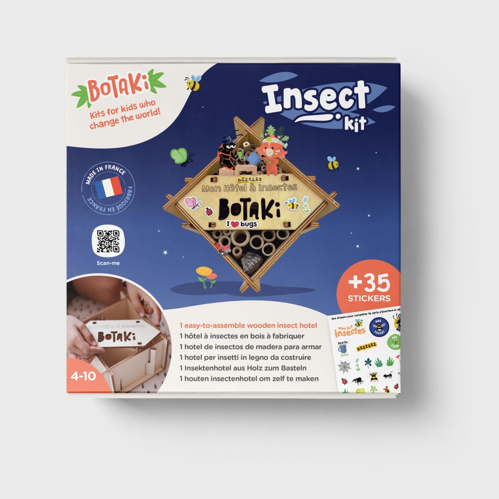 Ce kit permet aux enfants de construire un hôtel à insectes en bois pour abriter les petites bêtes. Ils le garnissent d’éléments naturels et le décorent avec des stickers résistants à l’eau.