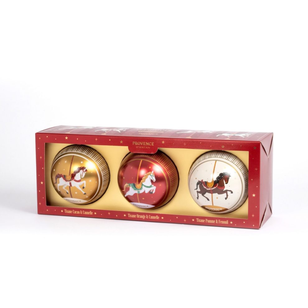 Ce coffret contient 3 boules de Noel métal chacune renferme une saveur de tisane différente. À déguster et